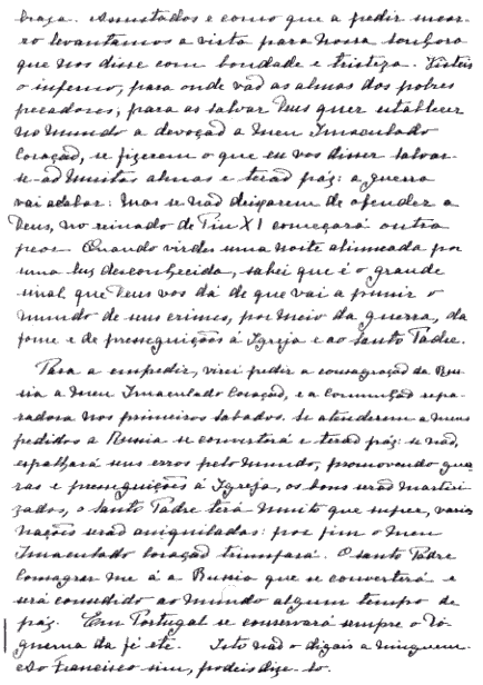 «Он обещает окончание войны вскоре в ответ на акт освящения, совершенный Его Святейшеством. Но поскольку оно было неполным, обращение России будет происходить позже. Если епископы Испании не будут исполнять Его желания, это (Россия) снова станет тем бедствием, которым Бог их наказывает ». 24